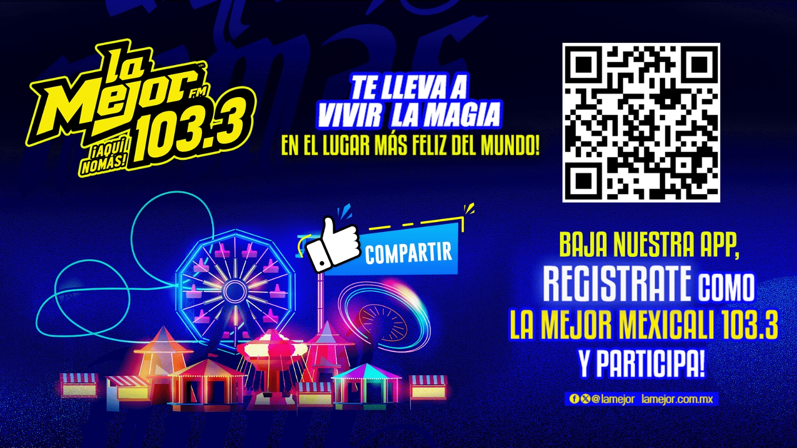 ¡La Mejor 103.3 te lleva al lugar más feliz del mundo! ¡Descarga la app, regístrate como La Mejor Mexicali y ya estás participando para un paquete familiar de 4 boletos!