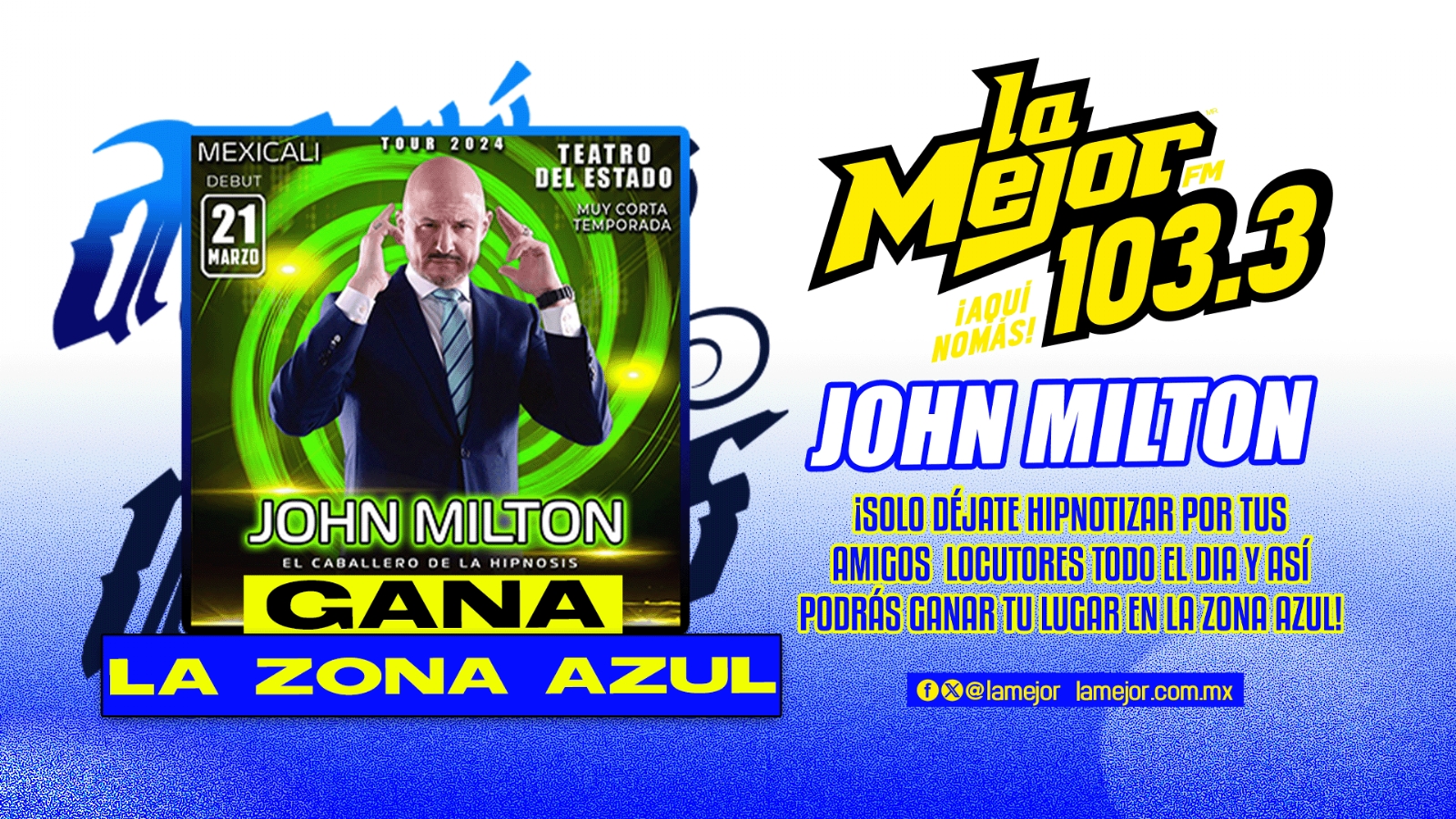 Déjate Hipnotizar por tus amigos locutores todo el día y podrás ganarte tus boletos para la zona azul de John Milton el Caballero de la Hipnosis
