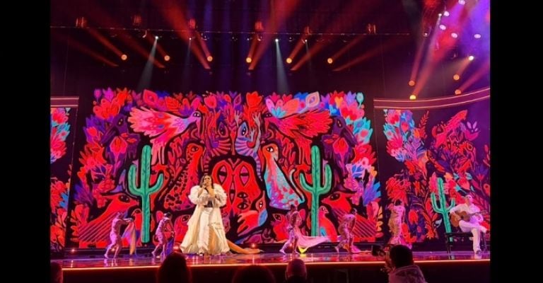 La silueta del vestido es tipo guante, ajustada al cuerpo, lo que aporta fuerza y presencia escénica sin perder sofisticación. El estilismo fue concebido por mi equipo creativo en México, encabezado por Álvaro Montaño, y el diseño es una creación de M de Iviachi, uno de los referentes de la alta costura en Guadalajara, Jalisco. Es una pieza que honra el talento mexicano y que, desde lo visual, acompaña el mensaje que quiero compartir: que la identidad se celebra, se construye y se defiende con estilo, pero sobre todo con convicción.