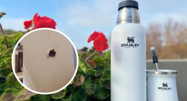 "POV: Mi termo Stanley me salva la vida durante un tiroteo frente a mi casa", escribió en su video, que acumula más de tres millones de reproducciones. "Fue un extraño accidente, honestamente. Mi prometido David y yo estábamos hablando de algo cuando escuchamos alrededor de 7 u 8 disparos y luego un fuerte golpe entró en mi casa", continuó explicando mientras mostraba el enorme agujero que la bala dejó en la pared.