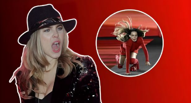 La princesa del pop llevaba un impactante mini vestido rojo que combinaba con botas altas hasta los muslos y un cinturón dorado. Todo marchaba a la perfección, hasta que a mitad de la pasarela tropezó y cayó hacia adelante.