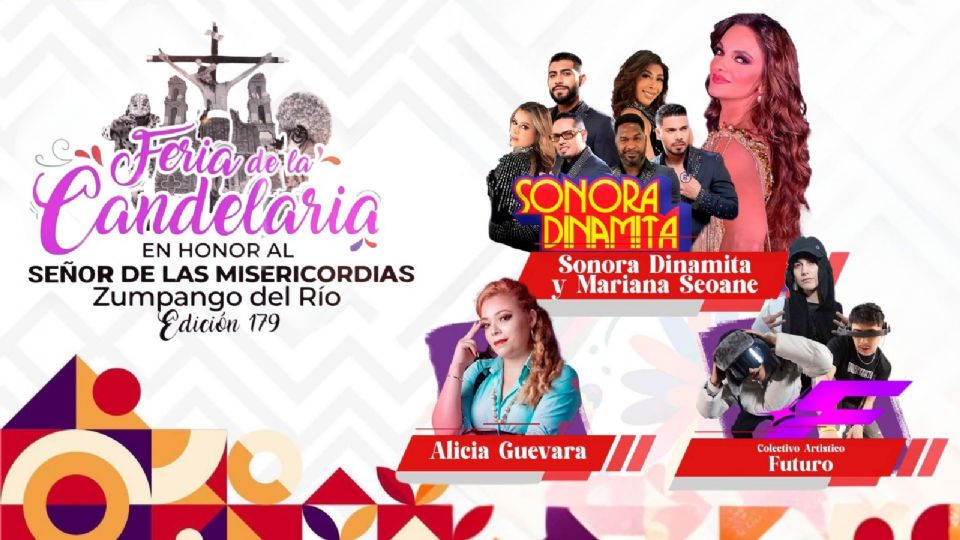No dejes pasar la oportunidad de ser parte de esta gran verbena de Guerrero. Este 5 de febrero, La Sonora Dinamita, Mariana Seoane, Alicia Guevara y Colectivo Artístico Futuro te esperan en la Feria de la Candelaria Zumpango del Río 2026 para vivir una noche inigualable.
