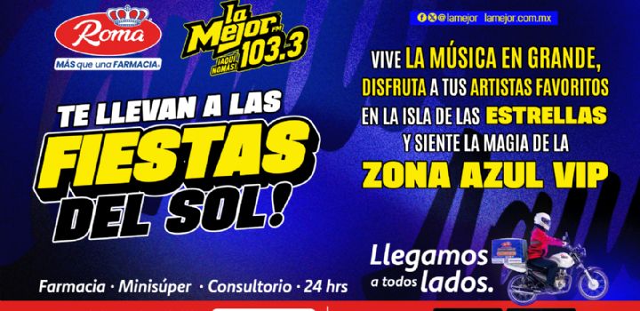 La Mejor FM 103.3 y Farmacias Roma te llevan a las Fiestas del Sol 2025, Gana 3 pases dobles y 1 VIP para la Isla de las Estrellas y Zona Azul VIP. Participa comprando $300 o más en sucursales: Madero, Justo Sierra, El Caballito, Santa Bárbara, Televisora y Vidaurri. Deposita tu ticket en la urna y… ¡listo!